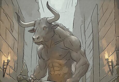 Minotaur One of the most famous examples of creatures from Greek mythology, the minotaur is part-man, part-bull—it has the head and tail of a bull, and the body of a man. In Greek myths, the minotaur lives in the center of the massive Labyrinth, an underground maze designed by the architect Daedalus for King Minos of Crete. The Minotaur is eventually slain by Theseus, an Athenian hero. Theseus is able to reach the center of the Labyrinth using a thread, given to him by the king’s daughter Ariadne. Before Theseus slays the minotaur, the kingdom’s tradition is to send fourteen young citizens into the Labyrinth every nine years as sacrifices for the Minotaur.